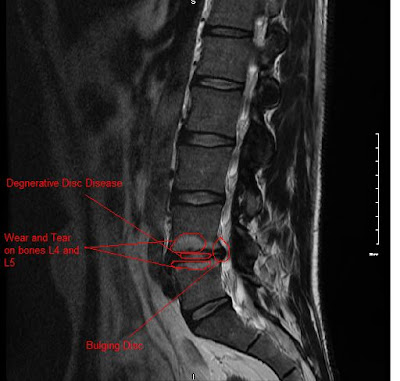Below is an MRI scan of my back, prior to surgery. I've added some comments to it:-